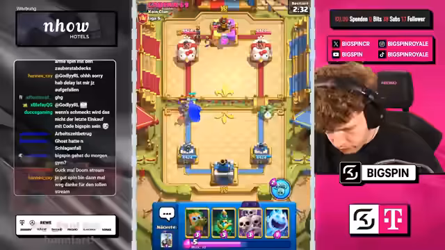 02:32:31In den letzten Spielen kämpft der Streamer gegen einen weiteren anspruchsvollen Gegner, der mit einem Brückenspam-Deck aufwartet. Obwohl er den Gegner zunächst als „gekokt“ und chancenlos betrachtet, findet dieser eine Antwort und verteidigt sich erfolgreich. Der Streamer äußert Frustration über seine eigene Spielweise und die Stärke des Meta-Decks, das der Gegner einsetzt. Trotz der Niederlage bleibt er bei seiner Strategie und beendet den Stream mit dem Versuch, das letzte Spiel zu gewinnen.