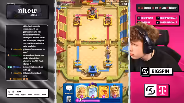 01:23:34Einem Sieg folgt ein weiteres Spiel gegen einen aggressiven Gegner, der mit Prinzessin und Ghost nervt. Der Streamer ist frustriert über diese Taktik und sieht den Königsturm bedroht. Obwohl der Streamer zunächst defensiv spielt, um gegnerische Truppen auf der anderen Seite des Bretts abzuwehren, plant er für das nächste Spiel eine proaktivere Taktik. Das Stream-Ziel ist es, den gegnerischen Druck zu ignorieren und selbst mit einem Golem in der Offensivseite anzugreifen, um das Spiel möglicherweise zu seinen Gunsten zu entscheiden.