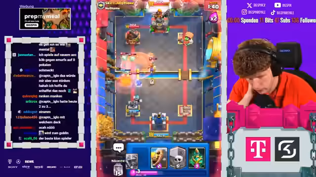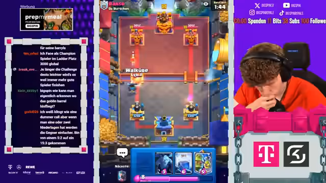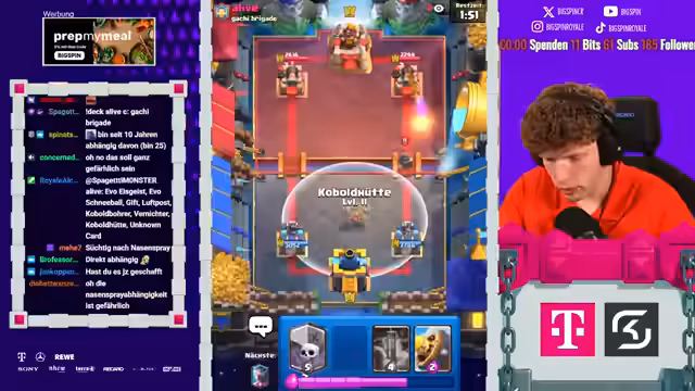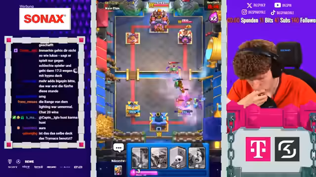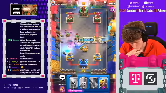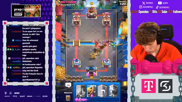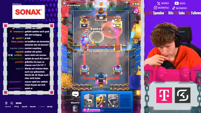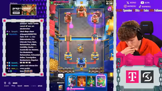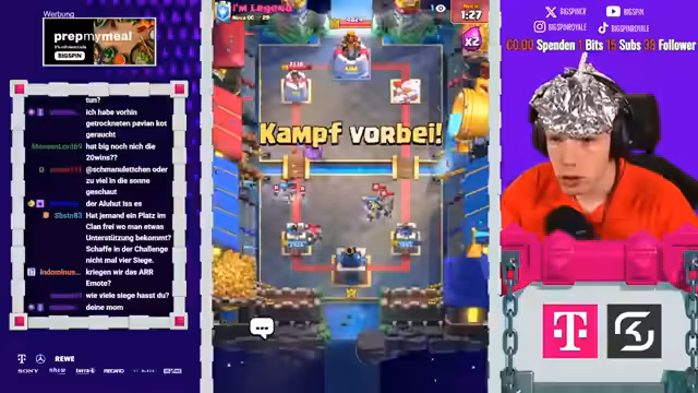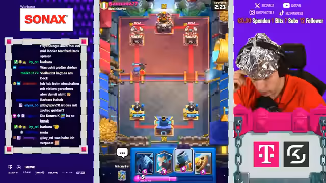 00:00:08Der Stream beginnt mit der Liveankündigung 'Papa Spin ist live' und wiederholten Hinweisen auf die 'Aluminiumhut'-Verschwörung. Der Streamer behauptet, dass sich Clash Royale gegen ihn verschworen habe und dies der Grund sei, warum er so oft gegen sehr starke Gegner ankommt. Der Fokus liegt auf der Glaubensfrage an die Verschwörung und an die eigenen Fähigkeiten.