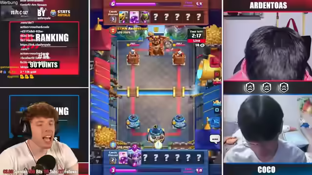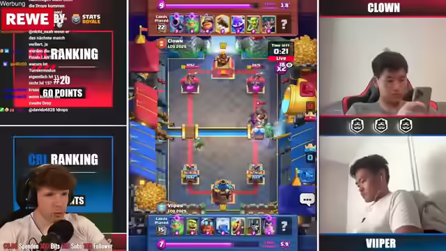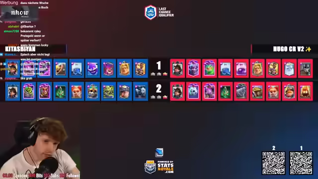 Analysen von Clash Royale Gameplay und Strategien. Vorbereitung auf den LCQ-Cast mit Teamanalyse. Der Streamer analysiert die potenziellen Gegner und Favoriten des Turniers, darunter Riley, Viper und Vitor. Er betont Vitors sympathische Art und Weise. Es wird erwähnt, dass es auch beim Last Chance Qualifier Preisgelder gibt, was die Motivation der Teilnehmer zusätzlich steigert.