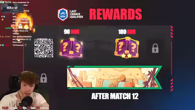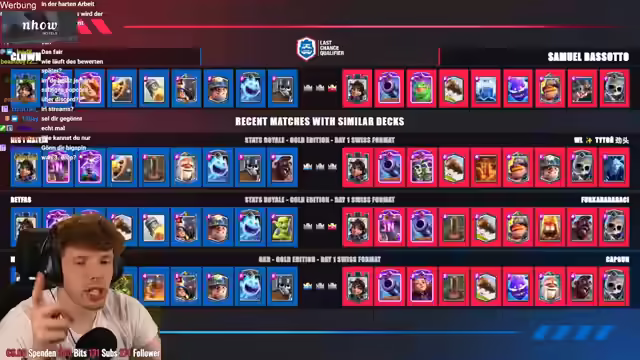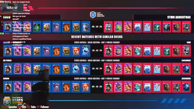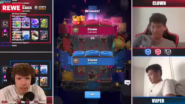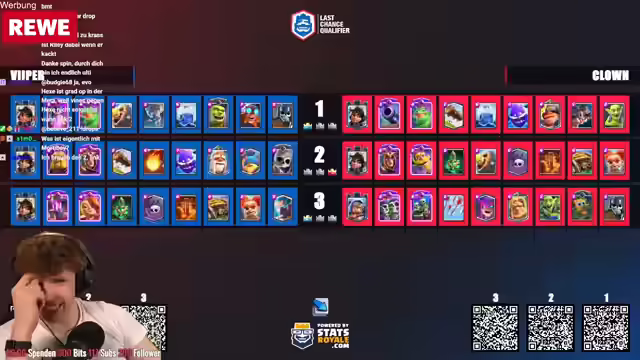 00:16:17Der Stream beginnt früher als gewöhnlich aufgrund des anstehenden Last Chance Qualifiers. Im vierten Spiel gegen Somon aus den Goblins analysiert der Streamer das Giant Skelly Deck des Gegners und setzt auf Ofen und Koboldhütte. Ein Fehler beim Poison-Einsatz führt zu einer schwierigen Situation, die jedoch durch geschickten Einsatz von Ranken und Valkyrie gemeistert wird. Trotz eines Freeze-Zaubers des Gegners und einer enttäuschenden Evo-Valküre gelingt es dem Streamer, das Spiel zu drehen und den vierten Sieg zu erringen. Im fünften Spiel gegen Für Ganinen setzt der Streamer auf einen frühen Poison gegen den Koch des Gegners. Trotz einiger Schwierigkeiten und einer drohenden Niederlage gelingt es ihm, das Spiel zu drehen und den fünften Sieg zu sichern.