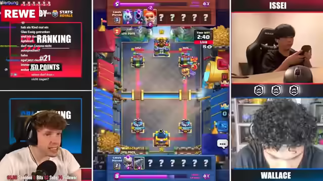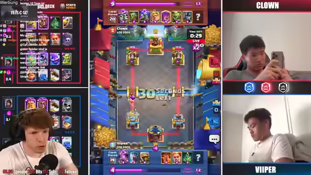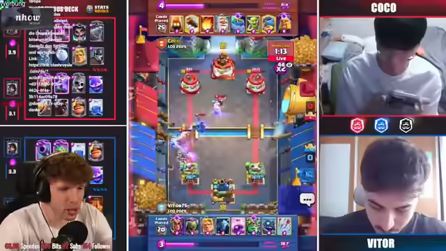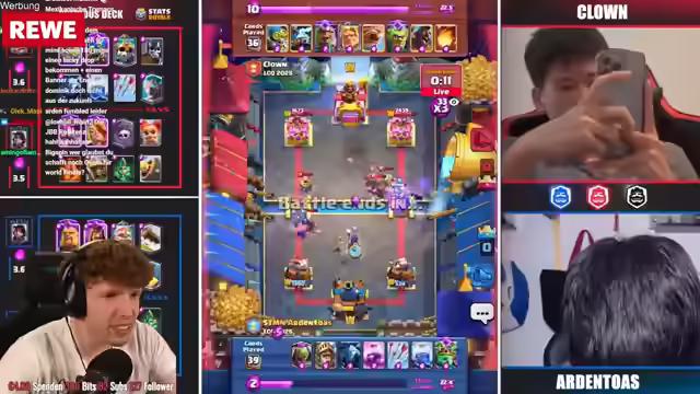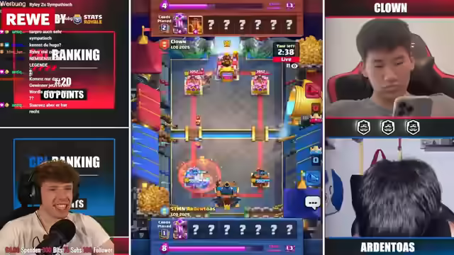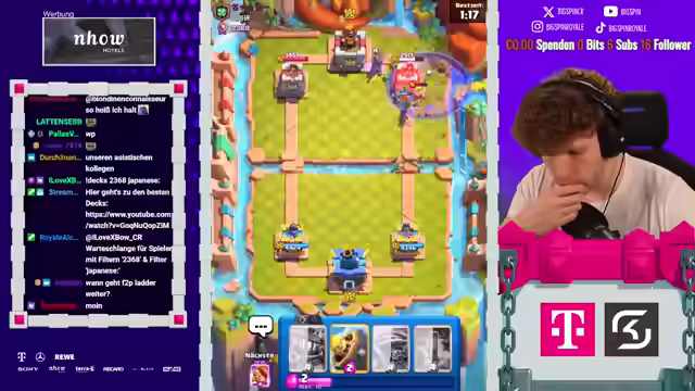 00:39:41In einer intensiven Clash Royale Runde analysiert der Streamer seine Spielzüge und die des Gegners. Er diskutiert den Einsatz von Karten wie Valkyre, Horde, Weins und Miner, um gegnerische Angriffe abzuwehren und eigene Angriffe zu starten. Dabei bewertet er seine eigenen Entscheidungen kritisch und erkennt Fehler, die ihn möglicherweise zurückwerfen könnten. Trotz einiger suboptimaler Spielzüge gelingt es ihm, die Runde zu gewinnen und seine Führung auf 7 zu 1 auszubauen. Anschließend bereitet er sich auf die nächsten Matches vor und äußert seine Vorfreude auf den bevorstehenden Cast, bei dem er das Gameplay anderer Spieler bewerten wird. Er analysiert das Spiel gegen James, der Queen und Poison einsetzt. Es wird ein Fenster für den Gegner eröffnet, Wallis zu bringen und dann eine Banditin oder was er hat. Durch ein simples Misplacement fällt auf einmal der Turm. Bubble wird eingesetzt, um die Queen zu kontern, und ein Poison wird vorbereitet. Der Streamer überlegt, wann er den Ofen setzen soll, um den Gegner zum Zünden zu zwingen. Er setzt eine Berserkerin und eine Walküre ein und spielt Vines. Trotzdem hat er ein Problem, sowas zu verteidigen. Er hätte eine Hütte einsetzen sollen, hat aber gegen den Evo-MK nichts.