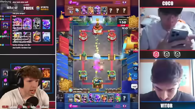 02:41:18Vitor greift im entscheidenden Spiel zu einem Koch-Deck, während Coco möglicherweise ein Hoggies Drill Cycle-Deck spielt. Es wird spekuliert, dass Coco das Anti-Bait-Deck oder das Hypnodeck spielt. Coco setzt auf Minions und den Golden Knight. Ein entscheidender Feuergeist-Sprung rettet Coco vor Schaden. Coco spielt mit E-Drag und Fischer, aber Vitor kontert mit Hexe und Goblin Giant. Das Deck von Coco wird als nervig und verbesserungswürdig beschrieben. Vitor gewinnt das entscheidende Spiel, obwohl sein Deck als unschön empfunden wird. Damit steht er im Upper-Bracket-Halbfinale. Abschließend wird kurz auf kostenpflichtige Primes hingewiesen.