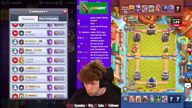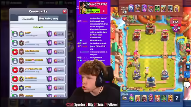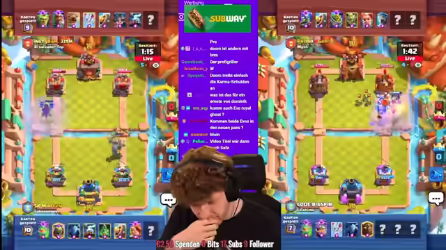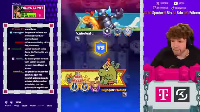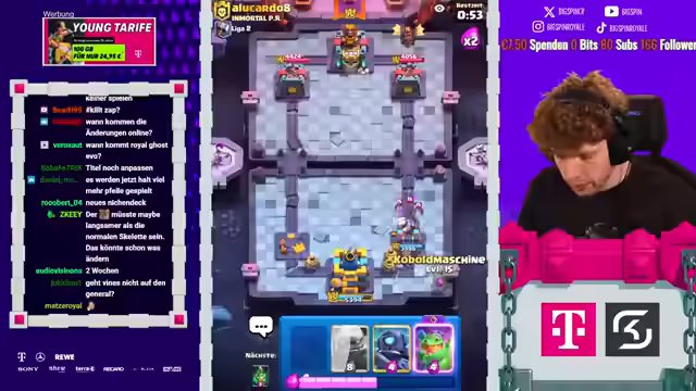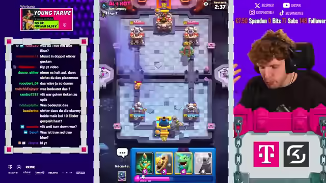 01:42:10Dominik kämpft in der letzten Minute der Saison um den Sieg und gewinnt. Das Spiel zwischen Zodiac und seinem Gegner wird nicht mehr gewertet, wodurch Zodiac das beste Saisonfinish verpasst. Zodiac verpasst die 4000 Trophäen nur um wenige Sekunden und beendet die Saison auf Platz 20 der Welt. Mohamed Light erreicht Platz 9, Sasuke Platz 4. Der Streamer bedankt sich für die Unterstützung und weist auf den Creator Code "Big Spin" hin. Nach dem Einsammeln der Belohnungen wird der neue Pass Royal gekauft und die Evo Skarmy getestet. Es wird ein Trick mit dem Spitten der Skarmy hinter den Golem ausprobiert. Der Streamer erwähnt, dass es noch Balanceänderungen geben wird und er noch ein Video dazu machen wird. Es wird ein Golem-Deck mit der Evo-Scarmi gespielt. Der Streamer kauft den Diamant Pass und aktiviert ihn. Anschließend testet er die Evo Skarmy in verschiedenen Decks und Situationen, um ihre Stärken und Schwächen zu analysieren.