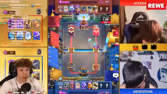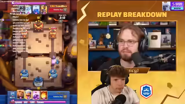 02:59:37Im Verlauf des Livestreams wurden mehrere Dritte im Clash-Royale-Turnier ausgetragen. Gensch Aslan spielte gegen Retired und konnte das Match mit 2:0 für sich entscheiden. Er verteidigte seine Decks sehr stabil und kassierte dabei kaum Schaden. In einem anderen Duell besiegte Ruben die Sandkiste, nachdem er sein Inferno-Deck gegen das Graveyard-Deck seines Gegners setzte. Ruben nutzte dabei geschickt Hexenmutter und Curse, um den Friedhof von Sandbox zu kontern und ihm jeglichen Schaden zu verwehren.