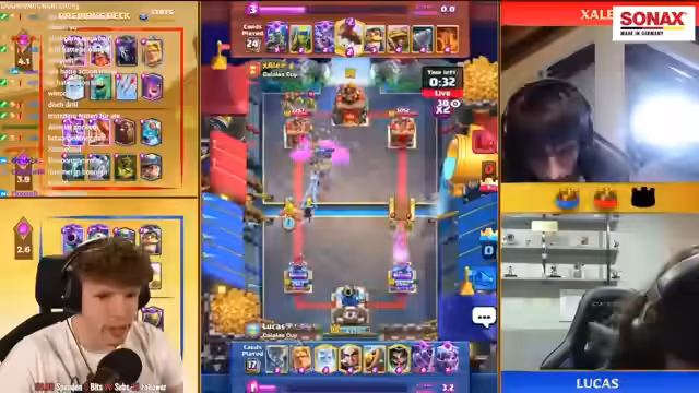 00:17:27Das erste Match zwischen LukasXGamer und Ale wird live übertragen. Der Streamer analysiert die Decks der Spieler im Detail, wobei Lukas mit einem schnellen Cycle-Deck und Ale mit einem Pekka-Brücken-Deck agiert. Trotz eines anscheinend schweren Matchups für Lukas gewinnt er die Serie knapp mit 2:1. Danach beginnt das nächste Duell zwischen Zapp und Hugo, bei dem Zapp mit seinem Main Deck, Royal Giant, gegen Hugo antritt.
