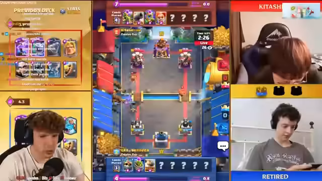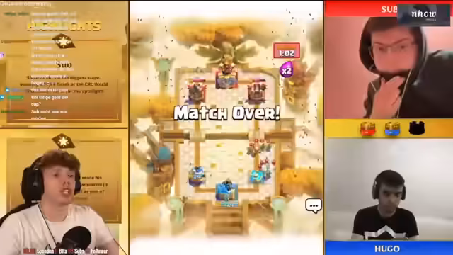 00:56:17Der Stream beginnt mit dem entscheidenden Match zwischen Hugo und Sub. Sub startet mit einem Mortar-Deck, während Hugo ein innovatives Lockbait-Deck einsetzt. Der Fokus liegt auf der Verteidigung des Mortar durch Sub, was Hugo extrem schwierig macht. Hugo nutzt Evo-Barrels, um Schaden zu verursachen, und setzt Sub stark unter Druck. Letztendlich gewinnt Sub jedoch durch effektiven Einsatz des Mortar und Dart-Goblins, was ihn in die Top 8 befördert. Das Spiel ist geprägt von taktischen Entscheidungen und hohem Schaden.