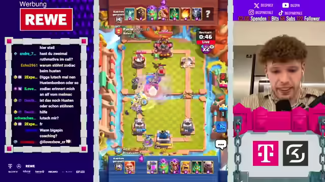 01:49:36Es wird festgestellt, dass Zodiac BigSpin coacht und ihm sein Deck beibringt. Es wird überlegt, ob BigSpin live gehen soll, um mehr Zuschauer zu generieren. BigSpin will in die Ladder reingehen, aber Zodiac bietet seine Hilfe an und verzichtet auf ein Turnier mit 50 Euro Einsatz, um BigSpin zu unterstützen. Sie beschließen, abwechselnd zu spielen. Es werden Plays besprochen, wie der Einsatz von Heilerin und Hexe, und die Notwendigkeit von Schleich Kobold gegen Lightning. Zodiac gibt Anweisungen für Plays, die bisher relativ selbsterklärend sind. Es wird überlegt, ob ein Golem-Einsatz sinnvoll ist. Es wird auch überlegt, wie man mit bestimmten gegnerischen Decks umgeht, wie zum Beispiel einem Friedhof-Deck, und welche Plays man dagegen machen kann. Es wird festgestellt, dass es einen Unterschied macht, ob man auf niedrigeren oder höheren Trophäen spielt.