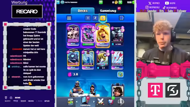 00:07:11Bigspin analysiert Montes aktuelles Deck mit 4,4 Elixir als zu teuer. Er identifiziert Synergien wie Giant und Mini-Pekka als stark, kritisiert aber den Mega-Ritter (7 Elixir) als zu teuer. Für Anfänger sei die Karte gut, aber erfahrene Spieler verteidigen sie leicht mit günstigen Einheiten. Die Musketiere wird als gut bewertet. Bigspin empfiehlt, den Mega-Ritter zu entfernen und stattdessen zwei Zauberkarten wie Feuerball oder Schneeball ins Deck aufzunehmen, um Probleme mit Inferno-Drachen zu lösen.