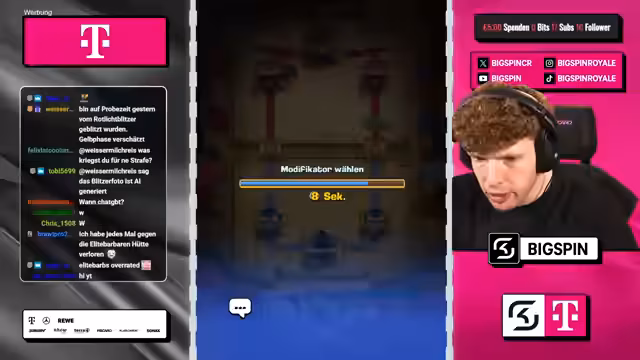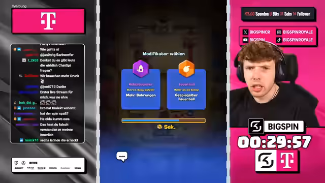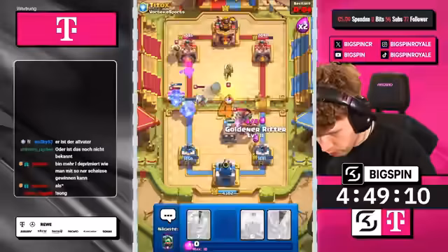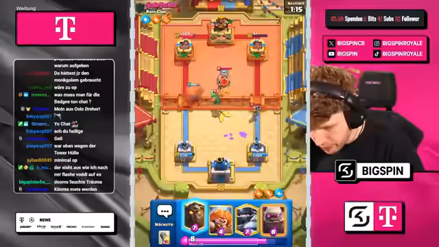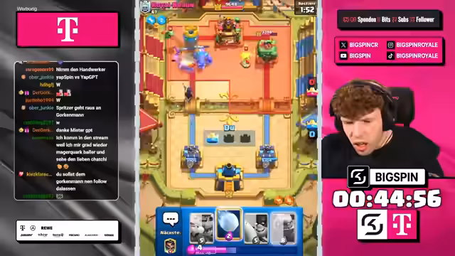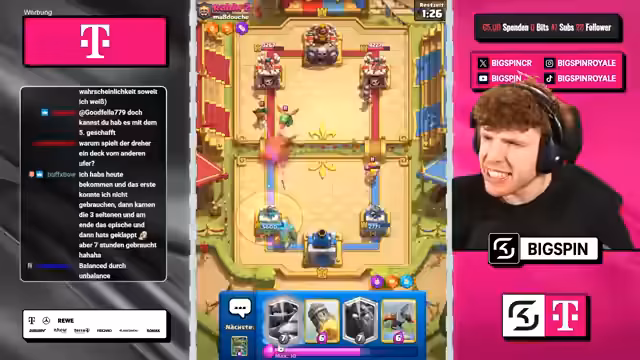 01:30:56Zu Beginn des Streamsegments zeigt der Streamer Frustration über eine Niederlage, die er dem vom Chat vorgeschlagenen Deck zuschreibt. Der Score steht bei 4:2-Niederlagen. Trotzdem wird ein neues Deck auf Basis von Mega-Ritter und Koboldbohrer ins Spiel gebracht. Der Streamer mischt sich stark in die Kartenauswahl ein und kritisiert wiederholte Vorschläge wie den Infernoturm als nutzlos und fordert mehr Abwechslung. Das Gespräch wird von spielerischen Einwürfen und dem Spannungsverhältnis zwischen den Partnern geprägt.