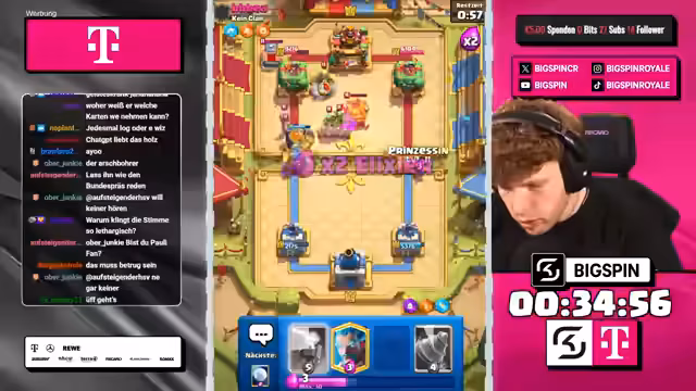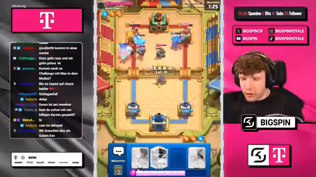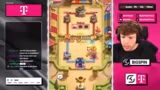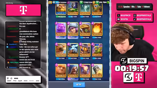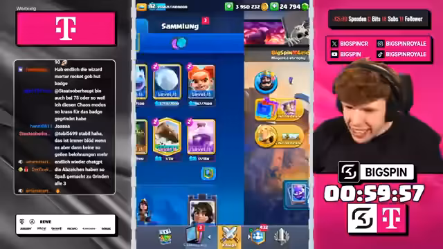 01:59:19Die Stimmung wechselt zu einem neuen Spielziel: der Versuch, mit dem im Chaos-Modus teuerstmöglichen Deck zu gewinnen. Das Deck umfasst Karten wie Golem, Goblin Giant und X-Bogen. Bei der Vorstellung des Decks wird ein populärer Bug mit dem Magic-Archer erwähnt, der in Zukunft getestet werden soll. Der Streamer analysiert das teure Deck und zeigt sich bei den ersten Partien unsicher, ob es gegen das favorisierte Golem-Deck bestehen kann.