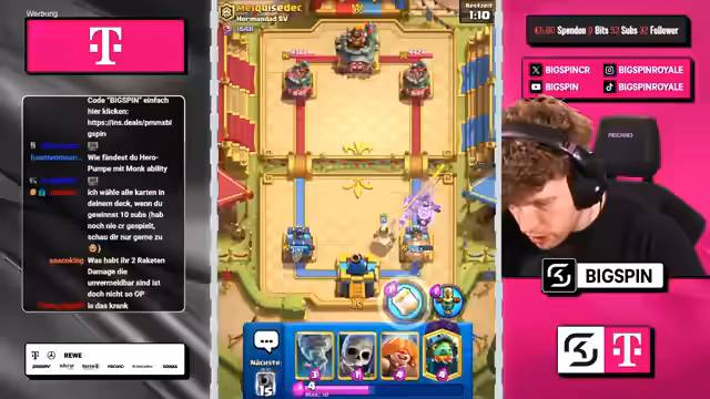 02:39:48Das Deck, das hauptsächlich aus Goblin-Riesen, P.E.K.K.A., Golem und dem MK besteht, erweist sich als sehr erfolgreich und wird als "krass", "wild" und "gottlos" bezeichnet. Der Streamer gewinnt damit nahezu jedes Game. Der günstige Preis der Karten im Chaos-Modus wird als Vorteil gegenüber teureren Decks hervorgehoben, da man mit diesem Deck "günstiger gewinnt".