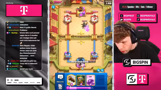 00:44:35Der Streamer verfolgt eine klare Strategie, indem er kontinuierlich seine Truppen wie die Berserkerin, den Eisgeist und den Busch zyklisiert, um den Gegner in die Defensive zu zwingen. Der Gegner setzt vermehrt Verteidigungskarten wie Hütten und einen Grabstein ein, was den Streamer als nervig, aber strategisch verständlich ansieht. Die Map erlebt durch das intensive Spielgeschehen eine Phase starker Verwirrung und dynamischer Veränderungen, in der der Streamer versucht, den Vorteil zu halten.
