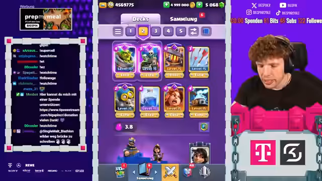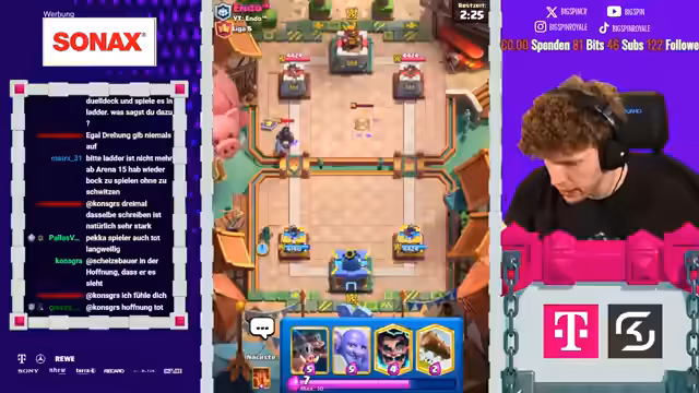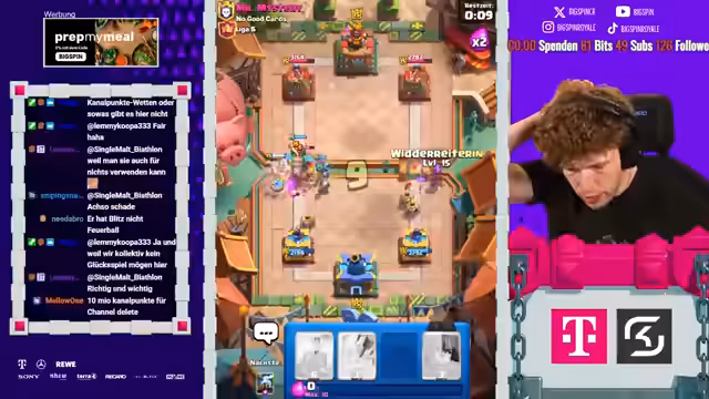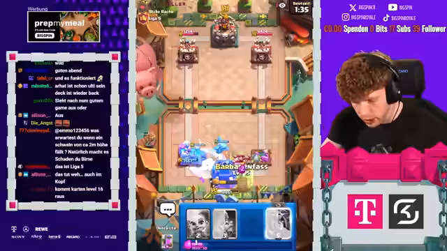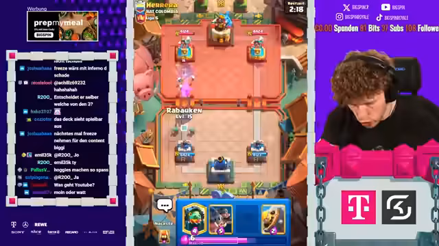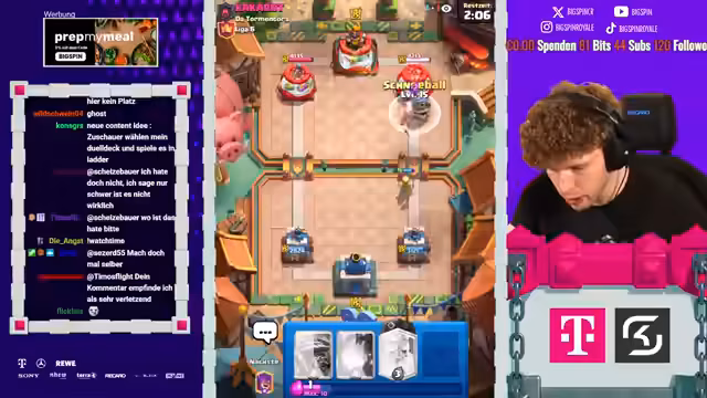 03:27:15Nach einem Sieg gegen Mr. Mystery und kurz vor dem Aufstieg in Liga 6, erhält der Streamer erneut eine ungünstige Deck-Auswahl mit Mini-Pekka und Fischer, was ihn frustriert, da Supercell scheinbar nicht möchte, dass er aufsteigt. Im nächsten Spiel trifft er auf ein Inferno Dragon Cycle Deck, gegen das sein aktuelles Deck keine Reset-Karten besitzt, was zu einer schnellen Niederlage führt. Es folgt ein weiteres "grauenvolles Deck" mit Holzfäller und Bogenschützen, welches gegen einen "besten Spieler" mit Queen und Kanone antreten muss und ebenfalls verloren geht. Die Deck-Zusammenstellungen werden als "Psychose" bezeichnet, da sie oft keine Synergien aufweisen und der Streamer das Gefühl hat, gegen Top-Spieler mit unfairen Matchups antreten zu müssen.