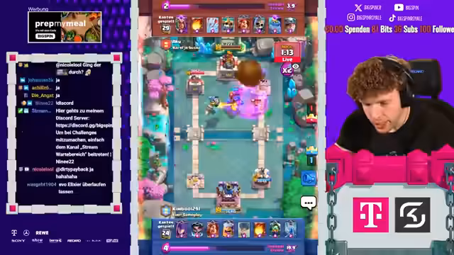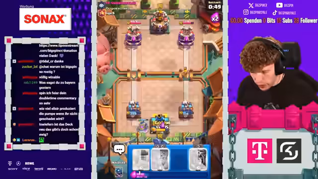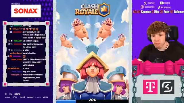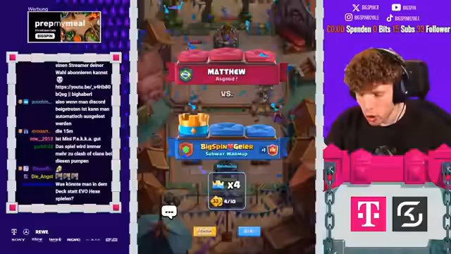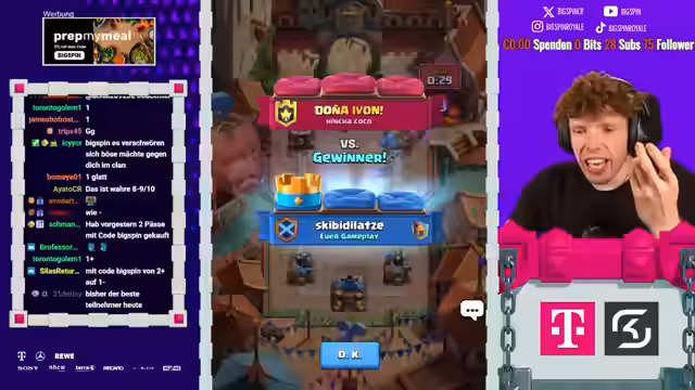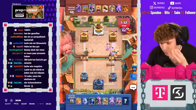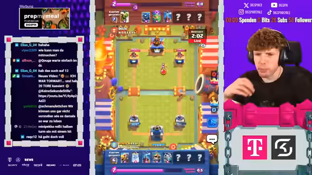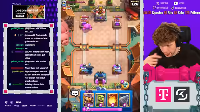 00:03:58Nach der Vorstellung des Golem-Decks wird angekündigt, dass um 20:30 Uhr eine Gameplay-Bewertung der Zuschauer stattfinden wird. Die Teilnahme erfolgt über den Discord-Server des Streamers, wo man im Stream-Wartebereich auf eine Einladung hoffen kann. Das erste Match beginnt gegen ein Pekka-Freeze-Deck mit Evo-Elektro-Drachen, was als extrem schlechtes Matchup empfunden wird. Trotz anfänglicher Schwierigkeiten und des Gefühls, das Spiel zu verlieren, wird versucht, sich einzugewöhnen und eine Strategie zu finden. Der Gegner spielt ungewöhnliche Kartenkombinationen wie Barbarenhütte, Prinz und Hexe, was zu Verwirrung und Frustration führt. Es wird deutlich, dass das Deck des Gegners nicht den Erwartungen entspricht, aber dennoch effektiv ist. Das Match endet mit einem knappen Sieg für den Streamer, der das Spiel als „sauber runtergespielt“ bezeichnet.