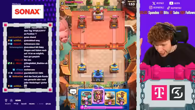 00:51:56Der Streamer beginnt mit der Analyse eines Gameplays, bei dem der Gegner eine Elixierpumpe setzt. Es wird vermutet, dass der Gegner ein Drei-Musketieren-Deck spielt, da Royal Hawks und eine Pumpe zum Einsatz kommen. Die Strategie des Streamers beinhaltet den Einsatz eines Baby-Drachens, gefolgt von einem Barbarenfass und einem Mini-PEKKA, um die gegnerischen Royal Hawks zu kontern. Trotz einiger Rückschläge, wie einem kassierten Treffer auf den Turm, gelingt es, eine Führung aufzubauen. Der Gegner versucht, mit drei Musketieren in einer Lane anzugreifen, wird jedoch überrannt, obwohl der Streamer eigene Fehler im Spiel macht. Der Golem wird eingesetzt, und das Spiel endet mit einem Sieg für den Streamer, der die Leistung des Gegners als unterlegen einschätzt.