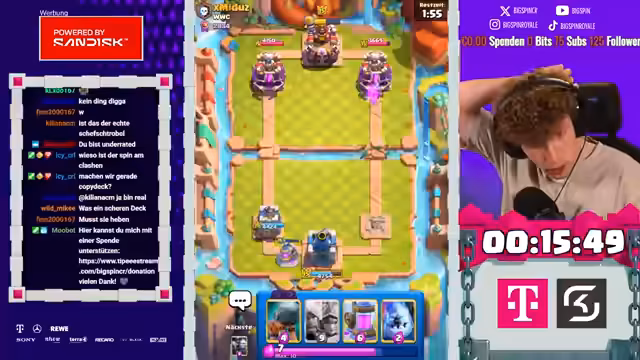 01:54:48Nach der Niederlage übernimmt der Streamer das gegnerische Deck, das zwei Prinz-Karten enthält. Schnell stellt er fest, dass das Deck fundamental schwach gegen andere Prinz-Decks ist, da es kaum Antworten auf den gegnerischen Angriff bietet. Einzig ein Sepp kann helfen, doch die Lage scheint aussichtslos, als der Gegner sofort Prinz-Brücke setzt.