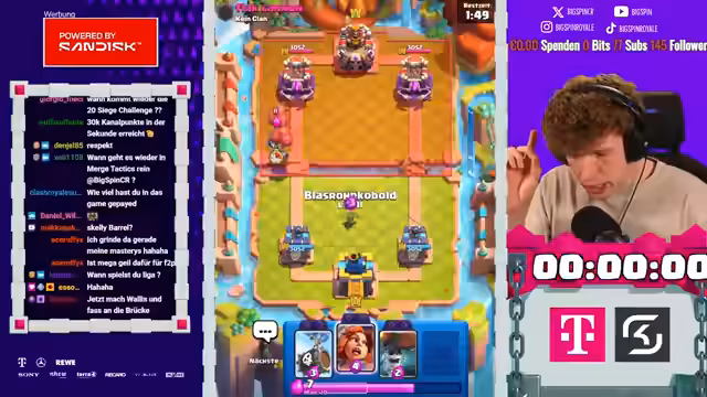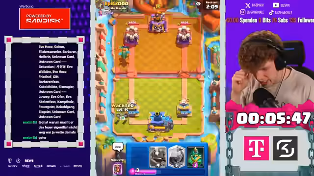 03:15:21Der Streamer setzt seine Siegesserie mit dem Dart-Goblin-Deck gegen verschiedene Gegner fort. Er analysiert die Eröffnungszüge seiner Gegner, die oft auf Recycling-Strategien oder den Einsatz von Karten wie Dolchherzogin setzen. Er passt seine Taktik an, indem er gezielt Valkyrien einsetzt, um die gegnerischen Angriffe zu absorbieren und mit Dart Goblins und Skelly Barrels konternt. Die Spiele enden jeweils mit klaren Siegen, da der Gegner dem ständigen Druck der schnell agierenden Truppen nicht gewachsen ist.