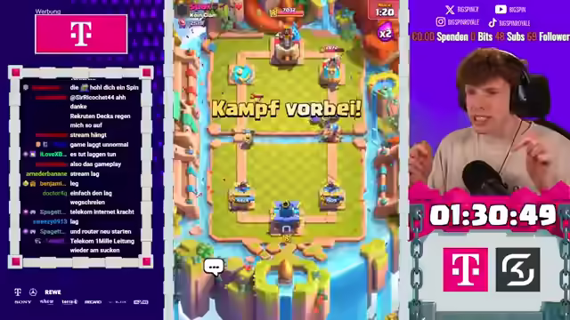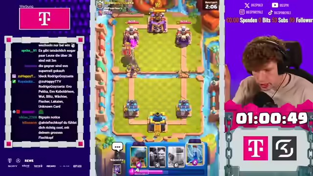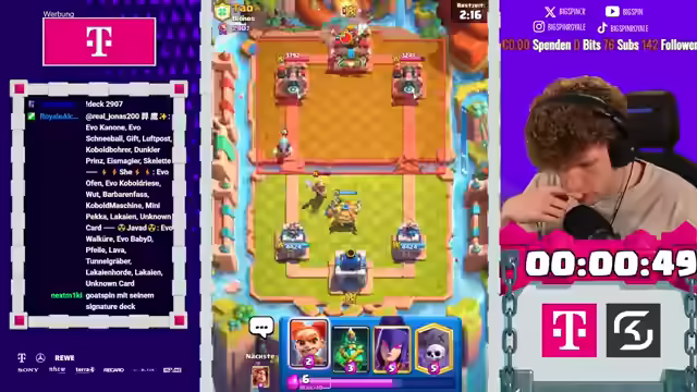 03:29:21Der Streamer analysiert die Spielweise des Gegners und erklärt, warum bestimmte Entscheidungen nicht effektiv sind. Er erklärt, dass die Evo-Kanone solide war, aber nicht ausreicht. Die Dagger ist tot. Der Streamer betont, dass die Dagger nicht gut ist. Der Kanonenspam reicht leider nicht aus. Der Streamer geht auf beiden Lanes vor, was den Gegner überfordert. Der Streamer spielt das beste Deck. Der Turm vom Gegner wird gleich fallen. Der Gegner bemüht sich noch mehr, aber das Game ist durch. Der Streamer hat acht Spiele in diesem Deck gemacht und alles gewonnen. Der Streamer fordert auf, die Fritten zu heben und dem Spin zu vertrauen. Der Gegner setzt den MK ein. MK-Cycle könnte auch wild werden. Der Streamer macht den Dart-Gummel rein. Der Gegner bringt den Evo-Zap rein. Der Gegner muss snowboarden. Der Typ hat ein Problem. Er ist gefangen in unserem Cycle. Der Gegner muss in jedes Skelly-Burl viel Elixir investieren. Der Streamer gibt dem Lord einen Call für eine Ladder-Session.