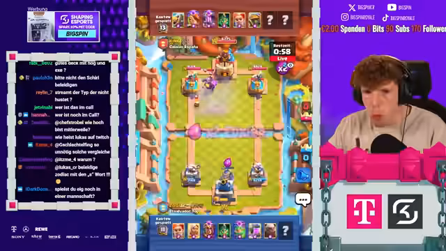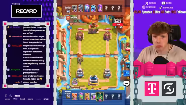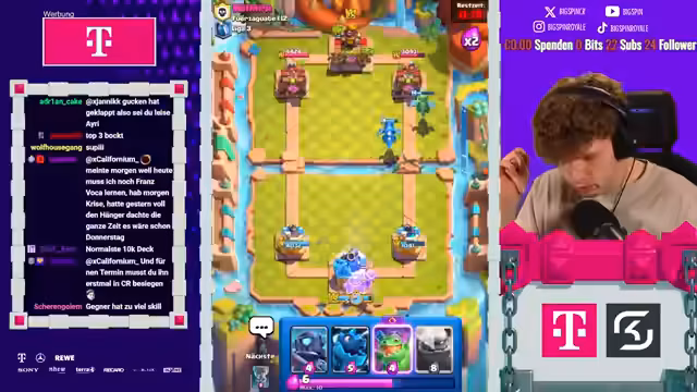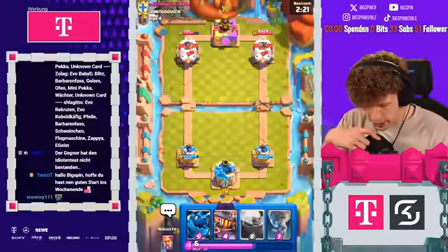 01:57:23Trotz anfänglicher Pessimismus findet der Streamer einen Weg, das ungewöhnliche Prinz-Deck zum Sieg zu führen. Durch präzises Platzieren von Karten wie Goblin Giant und Evo-Hexe gelingt es ihm, den Gegner unter Druck zu setzen. Der Gegner macht dabei entscheidende Fehler, die es dem Streamer ermöglichen, das Game zu gewinnen und seine Bilanz auf 7 zu 3 zu verbessern.