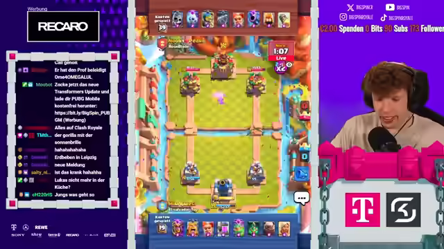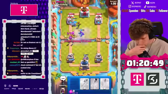 01:11:38Es wird festgestellt, dass viele Gegner Cycle-Decks spielen. Ein Ofen und ein Babyduggen werden eingesetzt, um den Golem des Gegners zu kontern. Ein Weint-Zauber wird gespielt, aber er ist nicht effektiv. Die Berserkerin und der Ofen werden eingesetzt, um Druck auszuüben. Der Elektro Dragon ist nutzlos und der Gegner erkennt die Spielweise. Der Turm wird zerstört und der Gegner verteidigt gut mit Royal Hawks und einer Queen. Vines und Mini Packer erweisen sich als entscheidend. Ein Golem wird gespielt, aber das Timing ist schlecht. Ein schönes Spiel wird gewonnen und Glückwünsche an Supporter werden ausgesprochen. Es wird beschlossen, direkt weiterzuspielen. Die Platzierung der Truppen wird erklärt, um einen 2er Push zu ermöglichen. Ein Holzfäller-Besacker und ein Ofen werden eingesetzt. Ein Fehler mit dem Spirit wird festgestellt, der sich nicht auflädt, was zu Frustration führt. Ein schönes Spiel wird gewonnen und die 50 Joker werden erreicht. Der Gegner spielt mit einer Karre und der Golemische wird hinten platziert. Der Gegner hat viele Einheiten, darunter Rekruten, Goblin-Gang und Kanonen-Karre. Es wird festgestellt, dass das Deck des Gegners sehr stark ist und schwer zu kontern ist. Es wird beschlossen, zum Main-Account zu wechseln. Trotzdem wurden gute Fortschritte gemacht und 100 Gems erhalten. Es wird erwähnt, dass 2000 Gems bereits wieder 20 Champions in der GC ermöglichen. Es wird zum Main-Account gewechselt, um für 100 Minuten jedes Gegnerdeck zu kopieren. Es wird festgestellt, dass auf dem Free-the-Player-Account oft gegen Crackerinnen gespielt wurde. Ein Countdown wird gestartet und das Ziel ist es, so hoch wie möglich zu kommen. Es wird bedauert, dass der Koch nicht mehr erhältlich ist. Es wird gegen Potro gespielt und das Ziel ist es, am Seasonende gegen die Besten der Welt zu spielen und jedes Gegner-Deck zu kopieren.