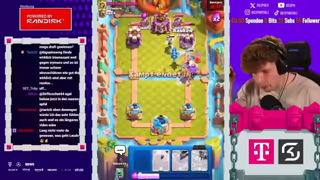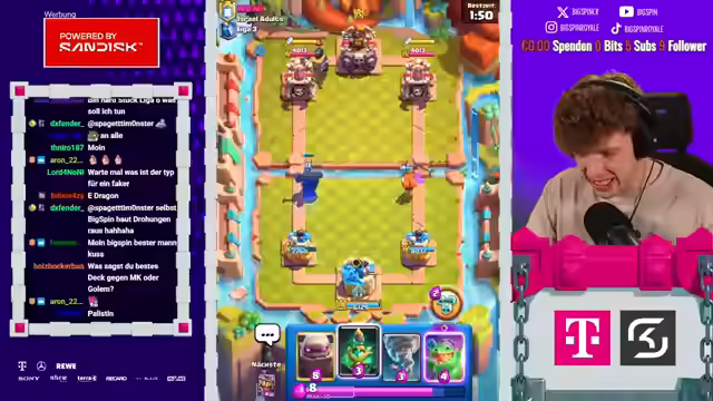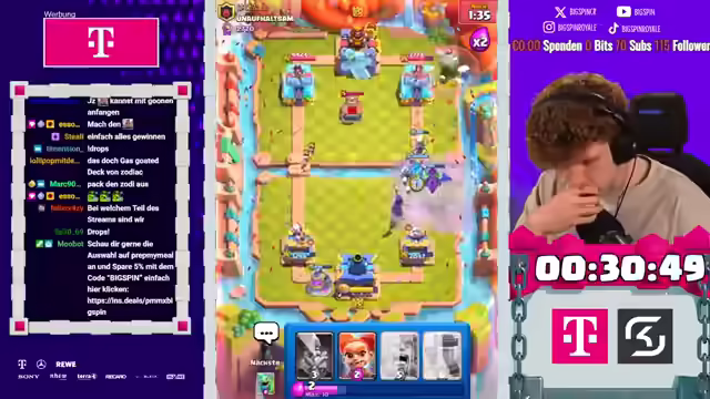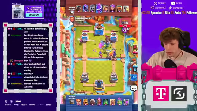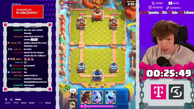 02:22:53Es wird ein anspruchsvolles Deck gespielt, und es folgen spannende Games mit viel Skill. Der Streamer betont die Notwendigkeit, den Gegner unter Druck zu setzen, ist sich aber unsicher, ob dies gelingen wird. Der Gegner setzt Pfeile ein, was auf ein 3-Musketiere- oder X-Bogen-Deck hindeutet. Der Streamer äußert Bedenken, wie er gewinnen soll, wenn der Gegner eine Pumpe auf dem Feld hat. Er antizipiert die nächste Pumpe des Gegners und setzt entsprechend seine Einheiten. Der Streamer erkennt, dass er bei einem 3-Musketiere-Spiel verloren hat, versucht aber, mit einem Skelly King gegenzuhalten. Es wird ein Plan entwickelt, um mit Logcycle eine der Musketieren auszuschalten. Der Streamer hat eine Idee, die irgendwie funktioniert, und setzt Dart Goblin, Bush und Scaliball ein. Der Gegner hat den Koch, was bedeutet, dass der Streamer bei einer Pumpe machtlos ist, da er keine Karte dagegen hat. Er vermutet, dass der Gegner Vines spielen wird.