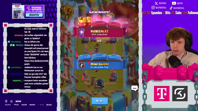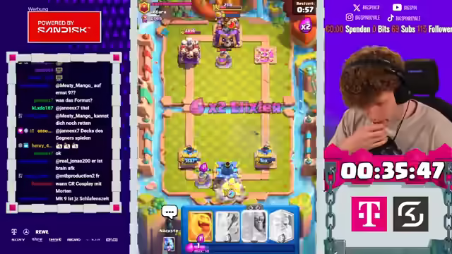 02:47:40Der Streamer spielt gegen einen Brücken-Spam-Gegner und macht guten Damage. Der Streamer vermutet, dass der Gegner gleich rein will. Der Streamer kann die Pumpe anchargen. Der Streamer hat das Gefühl, dass er das jetzt krachen könnte bei ihm. Der Streamer macht meine hier, der Gegner muss Banditen spielen, Bandite kracht. Der Streamer zündet hier, das sind Pfeile, die wir aus irgendeinem Grund im Deck haben. Hier gibt es Minions. Der Gegner hat nichts gegen die Minions. Jetzt einfach nur noch defensive Minenwerfer zirkulieren und wir gewinnen das Ding. Der Streamer spielt gegen ein 3-Musketiere Cycle-Deck. Der Streamer setzt mal seinen Turm. Der Streamer spielt eine Pumpe. Der Streamer muss mit 3M einen Lane irgendwie versuchen, den Gator Hops zu nehmen. Er würde jetzt nämlich dasselbe versuchen. Dann müssen wir irgendwie genug Elixier haben für 3M. Der Streamer hat keine Ahnung, wie er das gern gewinnen soll. Wir haben den perfekten Zap gebracht. Die Maschine wurde Comeback-Resettet. Der Streamer sagt, irgendwie bin ich der Beste oder so. Keine Ahnung.