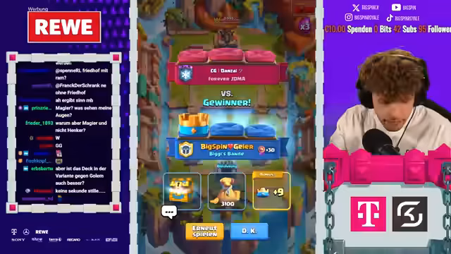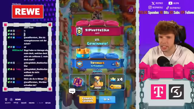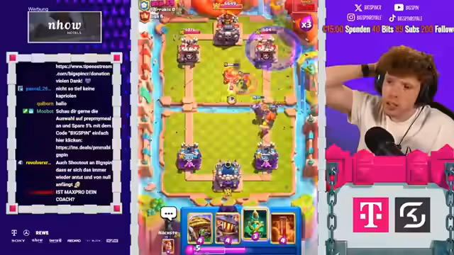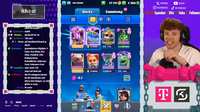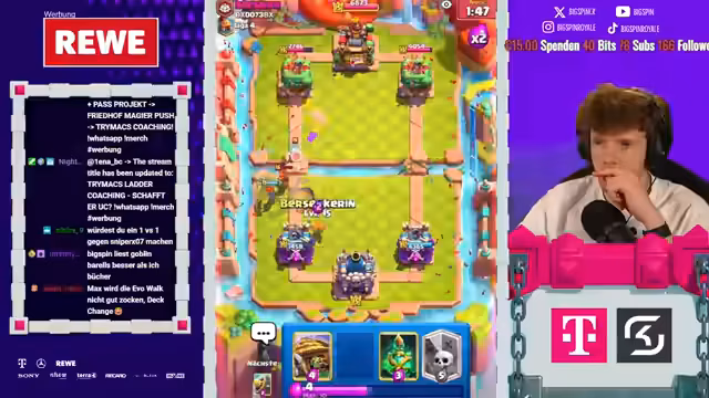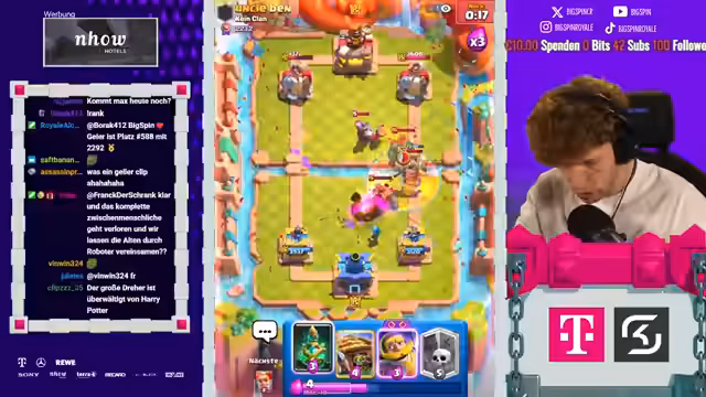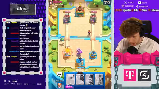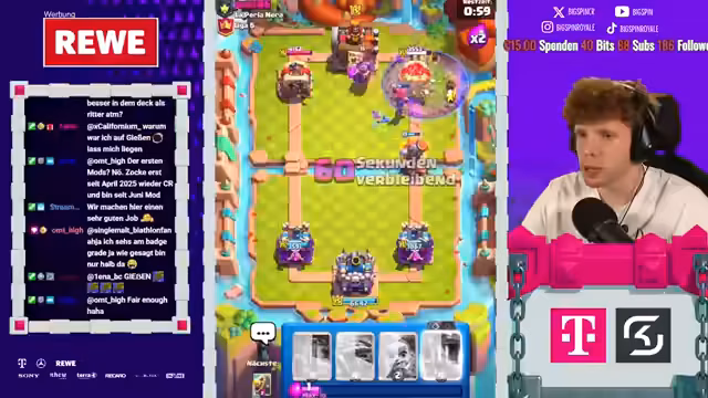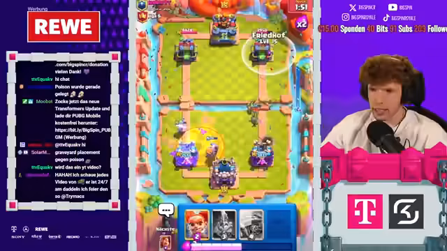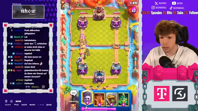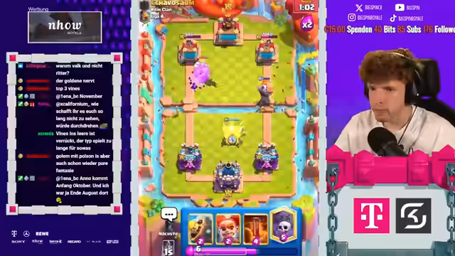 01:54:54Der Streamer spielt gegen einen Gegner mit E-Giant und Cage und setzt Berserkerin und Goblin-Hütte ein. Er überlegt, ob er den Weins direkt spielen soll, entscheidet sich aber für die Hütte. Der Gegner hat ebenfalls den Lightning, was die Situation erschwert. Durch eine Top 3 Hexenmutter-Szenario entsteht ein dickes Problem, das aber verteidigt werden kann. Der Streamer hat keine Ahnung, wie er das geschafft hat, aber er lebt noch. Er liegt hinten und der Gegner hat eine Hexenmutter. Der Streamer fragt sich, wie er den Schaden aufholen soll und erwartet, dass der Gegner seinen Agent platziert. Stattdessen kommt ein Bomber, der mit Vines ausgeschaltet wird. Der Magier wird eingesetzt, und der Gegner leignet ihn nicht. Der Streamer sieht eine Chance und setzt Ritter und Poison ein. Durch den Einsatz von Vines, Barbell und Magier kann der Gegner unter Druck gesetzt werden. Der Magier verursacht Schaden am Turm, aber es reicht nicht für den Sieg.