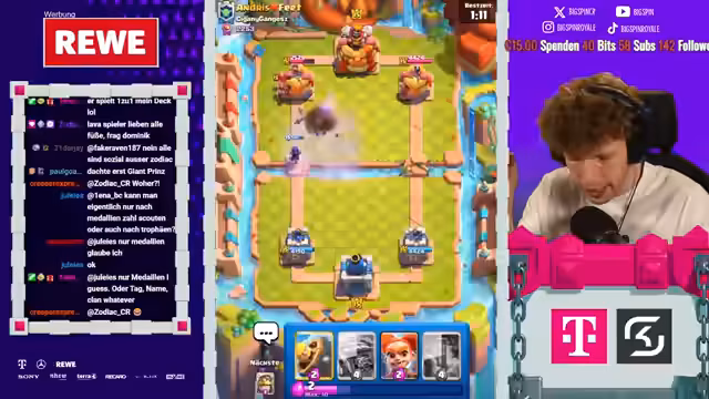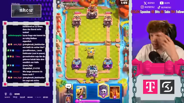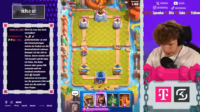 01:35:23Ein Fairplay-Moment wird hervorgehoben, in dem ein Gegner einen Fehler des Streamers nicht ausnutzt und stattdessen mit einem Daumen nach oben reagiert. Der Streamer lobt diesen Ehrenmann und vergibt den Fairplay-Pokal. Trotzdem wird das Spiel ernst genommen und versucht zu gewinnen. Der Gegner spielt ein Golem- oder Goblin Giant-Deck, was als problematisch angesehen wird. Der Magier wird eingesetzt und seine Fähigkeit, Schaden zu absorbieren, wird gelobt. In einer weiteren Partie gegen ein Giant Sparky-Deck erweist sich der Magier ebenfalls als nützlich, obwohl ein Fehler bei der Platzierung gemacht wird. Der Streamer betont, dass der Magier auch in diesem Matchup sehr gut ist, aber ihm im Vergleich zum Ofen etwas Reichweite fehlt. Trotzdem gelingt der Sieg dank des Magiers. Der Streamer spielt weitere Runden und muss sich gegen X-Bogen und Monk Reflection beweisen, wo der Magier nicht so stark ist. Trotzdem gibt er sein Bestes und versucht, das Spiel zu gewinnen.