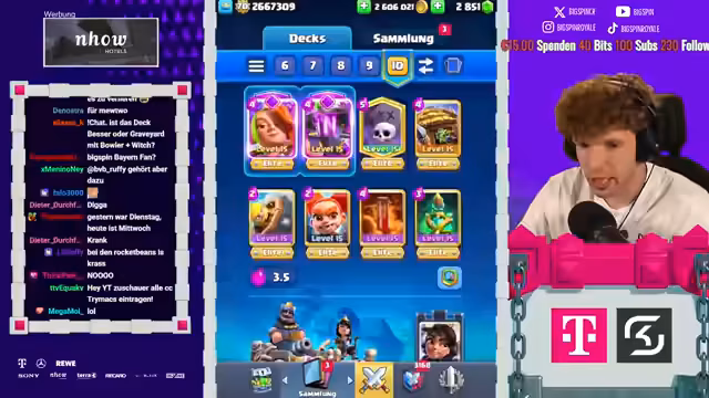 02:21:53Der Streamer analysiert weiterhin verschiedene Matchups und passt sein Deck entsprechend an. Er spricht über ein Spiel gegen einen Level 16 Pekka und die Schwierigkeiten, gegen solche starken Gegner zu bestehen. Der Streamer reflektiert über die Bedeutung des Matchups und wie es den Ausgang des Spiels beeinflussen kann. Er diskutiert auch die Notwendigkeit, die richtigen Karten auf der Hand zu haben und wie dies den Spielverlauf beeinflusst. Des Weiteren interagiert der Streamer mit der Community, beantwortet Fragen und bedankt sich für den Support. Er spricht über verschiedene Deckvarianten und welche Karten in bestimmten Situationen am besten geeignet sind. Der Streamer betont die Bedeutung von Flexibilität bei der Deckzusammenstellung und die Notwendigkeit, das Deck an die aktuelle Meta anzupassen, um wettbewerbsfähig zu bleiben. Erwähnt werden auch verschiedene Top-Spieler und deren Deckvarianten, um die Vielfalt der möglichen Strategien zu veranschaulichen.