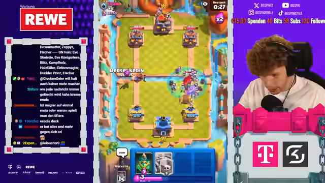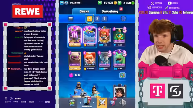 00:13:17Der Streamer passt seine Strategie an, nachdem er gegen einen Gegner mit einem Pekka-Kanonen-Deck verloren hat. Er stellt fest, dass die Level-15-Evo-Hexe eine große Herausforderung darstellt. Es wird überlegt, die Geisterkaiserin aus dem Deck zu entfernen oder sie zu verbessern, da sie auf Level 12 nicht mehr so effektiv ist. Stattdessen wird der normale Baby Dragon auf Level 14 in Betracht gezogen, um gegen die häufigen Hexen-Gegner besser bestehen zu können. Der Streamer experimentiert mit verschiedenen Spielstilen, einschließlich des häufigeren Einsatzes des Level-15-Golems. Trotzdem kämpft er weiterhin gegen überlevelte Gegner und muss sich ständig anpassen, um erfolgreich zu sein.