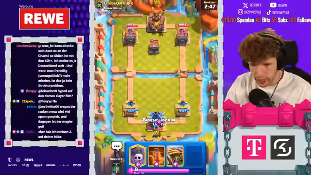 00:46:38In einem Match setzt der Streamer die Berserkerin ein und kontert den Gegner mit einem Elektro-Drachen. Er freut sich darüber, dass der Elektro-Drache endlich Level 14 erreicht hat, was sich in den Interaktionen im Spiel zeigt. Der Elektro-Drache überlebt dank des Upgrades länger und erzielt wichtige Vorteile. Der Streamer setzt den Golem ein und kontert die Prinzessinnenbrücke des Gegners. Der Elektro-Drache zusammen mit dem Golem dominiert das Spiel und führt zum Sieg. Der Streamer betont die Bedeutung des Schadens, den der Elektro-Drache verursacht, und sichert sich den Sieg, obwohl der Gegner aggressive Überraschungsmomente hatte. Er beschreibt, wie er den Gegner mit einem Golem-Push überwältigt und den elektronischen Drachen zur Unterstützung einsetzt.