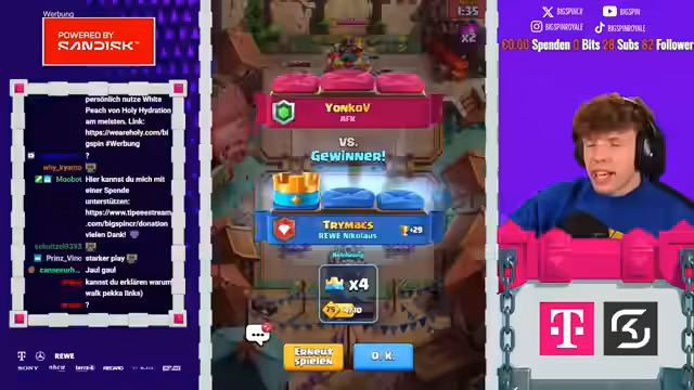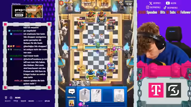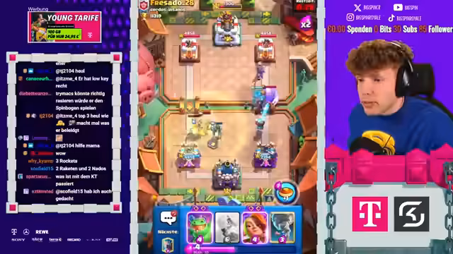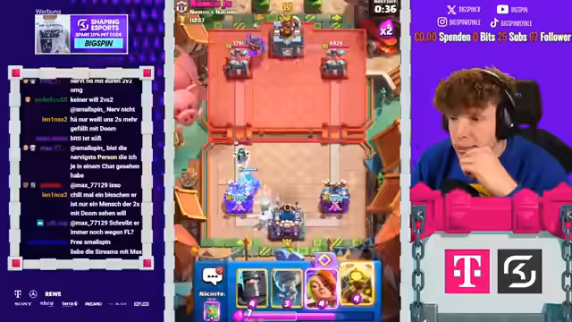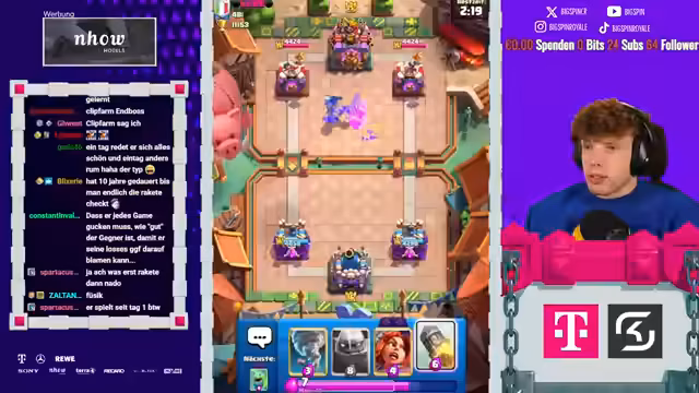 00:04:11Nach den anfänglichen Vorbereitungen und einer kurzen Diskussion über persönliche Frisuren, die überraschend oft als natürlich wahrgenommen werden, geht es direkt in die ersten 2 gegen 2 Matches mit DoomCR. Das Ziel ist klar: Platz 1 der Welt zurückzuerobern. Die Spieler befinden sich zu Beginn auf Platz 270 der Rangliste. Das erste Spiel beginnt mit intensiven Aktionen und strategischen Zügen, wobei eine "geisteskranke Poison Value" und "insane Lightning"-Einsätze hervorgehoben werden. Trotz einiger kritischer Momente, in denen ein halber Turm fällt, gelingt es dem Duo, das Spiel durch gut koordinierte Angriffe und Verteidigungen zu gewinnen. Die Freude über den Sieg ist groß, und die Spieler loben sich gegenseitig für die gute Zusammenarbeit und die erfolgreichen Calls, die das eingespielte Teamwork unterstreichen. Die Stimmung ist euphorisch, und die Spieler sind bereit für die nächsten Herausforderungen.