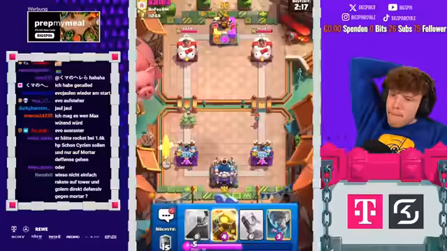 03:08:27Der Streamer und sein Coach analysieren die aktuelle Spielsituation und stellen fest, dass der Kingtower aktiv ist und ein erheblicher Schadensvorteil besteht. Das Deck des Streamers wird als „OP“ bezeichnet, da es drei E-Woods enthält, was einen klaren Vorteil gegenüber dem Gegner darstellt. Es wird die Strategie besprochen, Raketen gezielt einzusetzen, insbesondere wenn doppelte oder E-Wax-Karten im Spiel sind. Der Einsatz von Mini-Pekka, Ice-Mager oder Valkyre wird erörtert, um gegnerische Angriffe abzuwehren und eigene Pushes aufzubauen. Die Wichtigkeit, Valkyre rechtzeitig einzusetzen, um kritischen Schaden zu vermeiden, wird betont. Weiterhin wird die Notwendigkeit eines Dark Prince-Einsatzes zur Unterstützung des Golems diskutiert, um den Gegner unter Druck zu setzen und einen erfolgreichen Push zu gewährleisten. Die Analyse zeigt, dass das Verständnis der eigenen Karten und der gegnerischen Deck-Zyklen entscheidend für den Sieg ist.