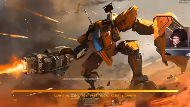 05:33:43Nachdem der Streamer seinen Account eingeloggt hat, startet er das Tutorial-Training. Er steuert einen großen Mech, der durch WSD bewegt wird, und hat mit Q und F zwei besondere Fähigkeiten, die sich durch eine Stamina-Leiste regenerieren. Er erkundet das Inventar und findet Munition, Struktur und Schild als primäre Ressourcen. Es wird erklärt, dass man durch Einsammeln blauer Ressourcen Level-Up-Punkte für den Hunter sammeln kann.