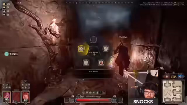 04:26:51Während des Spiels kommt es immer wieder zu Koordinationsproblemen im eigenen Team. Der Streamer analysiert die gegnerische Teamzusammenstellung aus Warlock, Wizard und Cleric und erkennt, dass er als Nahkämpfer gegen mehrere Fernkampf-Klassen unterlegen ist. Er fordert seine Mitspieler auf, sich auf zwei Seiten zu verteilen, um den Druck auf das gegnerische Team zu erhöhen. Seine eigenen Versuche, den Cleric zu eliminieren, scheitern trotz guter Treffer, da er selbst ständig unter Beschuss genommen wird.
