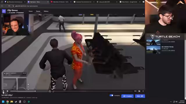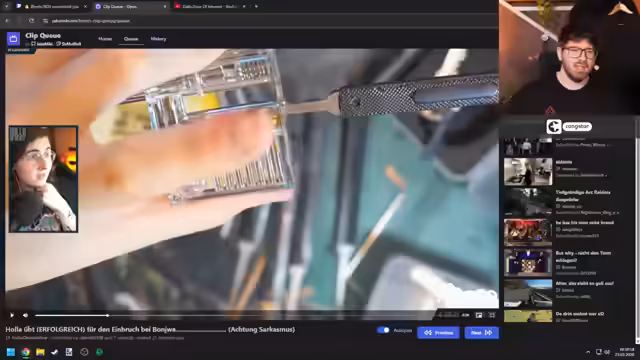 04:49:55Während des Streams wird ein Spiel gespielt, bei dem es darum geht, mit einem Fahrzeug zu zielen und schießen. Der Streamer schießt versehentlich auf sich selbst, was zu humorvollen Kommentaren führt. Ein anderer Spieler, Holla, übt erfolgreich das Knacken eines Schlosses, was Diskussionen über legality und Hobby auslöst. Es werden Clips von Spielen angesehen, bei denen es um das Zerschlagen von Objekten oder das Erreichen von Zielen geht, wobei oft unerwartete Wendungen und sehr herausfordernde Momente gezeigt werden, die für Unterhaltung sorgen.