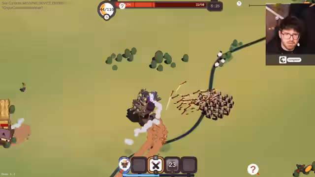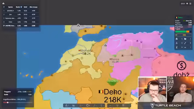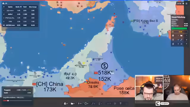 00:43:30Leon führt den Streamer in die Grundlagen des Spiels Open Front ein. Es werden die Mechaniken wie Truppenaufbau, Expansion durch Landnahme, Allianzen mit anderen Spielern und der Bau von Infrastruktur wie Städten erklärt. Beide spielen eine gemeinsame Runde, die jedoch schnell zu einem Debakel wird, als Leon den Streamer zu oft und mit zu vielen Truppen angreifen lässt, was zu einem rapiden Truppenverlust führt und den Streamer aus dem Spiel wirft.