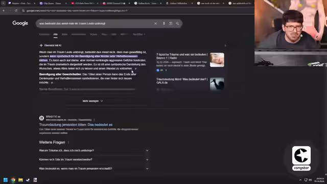 04:26:13Der Streamer erzählt von einem bizarren Traum, in dem er schwanger war und sich fragte, ob auch Männer schwanger werden könnten. Diese Traumsequenz führt zu einer Diskussion über Traumdeutung und deren Realitätsgehalt. Er vergleicht Traumdeutung mit Astrologie und äußert Skepsis bezüglich ihrer wissenschaftlichen Grundlage. Er teilt eine kürzliche Konversation mit Kim, in der beide von Träumen berichteten, in denen sie Menschen umbrachten. Die Suche nach der Bedeutung solcher Träume führt zu einer Erklärung, dass das Töten im Traum oft symbolisch für das Beenden alter Muster oder Verhaltensweisen steht und auf verdrängte aggressive Gefühle hindeuten kann. Der Streamer entwickelt daraufhin seine eigene 'Hobby-Psychologen, Anatomie, Physiologie, Interpretation' von Träumen, in der er das menschliche Gehirn mit einem Computer vergleicht: Kurzzeitgedächtnis als RAM und Langzeitgedächtnis als Festplatte. Träume entstehen seiner Theorie nach, wenn der RAM ausgelesen und auf die Festplatte gespeichert wird, wobei zufällige Synapsenfeuerungen vom Gehirn zu bizarren Traumerlebnissen interpretiert werden, die keine tiefere Bedeutung haben.