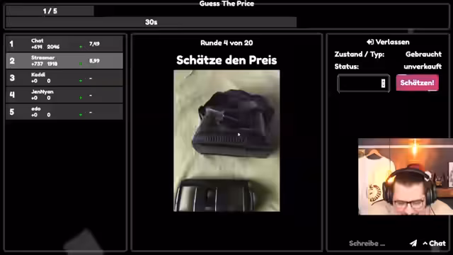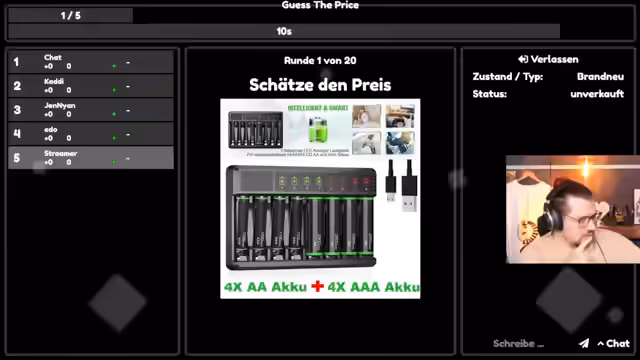 02:19:55Es beginnt mit der Diskussion über ein Brillenetui mit Wechselbügeln, dessen Preis auf etwa 40-50 Euro geschätzt wird. Die Teilnehmenden äußern Zweifel am Zustand des Artikels, da er nicht wie brandneu aussieht. Im Anschluss wird ein 26-Zoll-Fahrradreifen mit Deutschlandflagge thematisiert, dessen Wert zwischen 350 und 500 Euro vermutet wird, der tatsächliche Preis liegt jedoch bei 150 Euro. Darauf folgt eine LED-Gesichtsmaske, die als potenzieller 'Müll' betrachtet wird und deren Wert auf 25 Euro geschätzt wird, der tatsächliche Preis beträgt 21,90 Euro. Ein Manga wird auf etwa 12 Euro geschätzt, wobei der Chat 8 Euro vorschlägt. Der tatsächliche Preis liegt bei 9,68 Euro. Abschließend wird eine gelbe Brille der Marke 'Schariol' diskutiert, deren Wert auf 85-100 Euro geschätzt wird, der tatsächliche Preis liegt jedoch bei 153 Euro. Es wird ein refurbished Alienware Monitor für 300 Euro geschätzt. Die Runde endet mit der Schätzung eines unbekannten Produkts, bei dem 52 Euro vorgeschlagen werden, der tatsächliche Preis aber bei 44 Euro liegt.