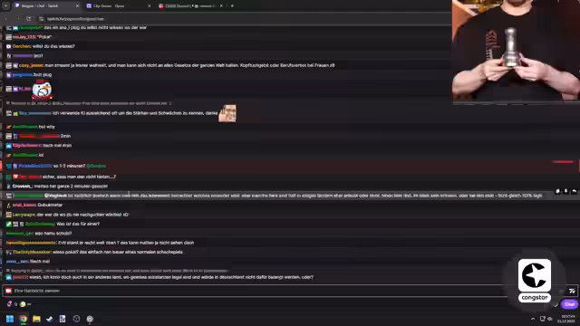 10:46:26Es werden verschiedene Streams und Projekte angesprochen. Ein sogenannter 'Dailydo' Clip wird geprüft, der angeblich einen 'Alt-F4' Joke beinhaltet, was jedoch als Trolle verspottet wird. Ein Expedition-Spiel hat einen Game of the Year Award verloren, da es mit KI entwickelt wurde, und es gibt Pläne für eine potenzielle Gerichtsprozess-Serie mit den Rollen 'Judge Mantle' und 'Staatsanwalt Aster'. Außerdem wird über die Preisgabe von persönlichen Informationen, wie einem Arbeitsverhältnis oder einer verhandelten Grafikkarte (5090 für 2800 Euro), diskutiert.