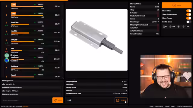 03:12:10Die Teilnehmenden schätzen den Preis eines Santorini-Kalenders, wobei die meisten zwischen 10 und 20 Euro liegen. Es wird überlegt, ob man höher oder tiefer schätzen soll, um die beste Taktik zu finden. Anschließend wird der Preis einer Brassband-Partitur diskutiert, wobei die Schätzungen zwischen 50 und 100 Euro variieren. Die Gruppe lobt ihre gute Taktik. Es wird über den Preis von DJ Bobo-Artikeln diskutiert, wobei die Schätzungen zwischen 10 und 35 Euro liegen. Die Teilnehmenden schätzen den Preis eines Artikels für Vögel, wobei die Schätzungen zwischen 10 und 14 Euro liegen. Es wird festgestellt, dass es sich um Futterhäuschen handelt. Danach wird der Preis eines alten PC-Chips geschätzt, wobei die Schätzungen zwischen 15 und 18 Euro liegen. Es wird vermutet, dass der hohe Versandpreis aus China kommt. Es wird eine Amazon-Fernbedienung geschätzt, wobei die Schätzungen zwischen 7 und 10 Euro liegen. Die Gruppe freut sich über die Punkte. Anschließend wird der Preis eines DJI-Filters geschätzt, wobei die Schätzungen zwischen 22,99 und 40 Euro liegen. Es stellt sich heraus, dass es sich um Filter für eine Drohne handelt.