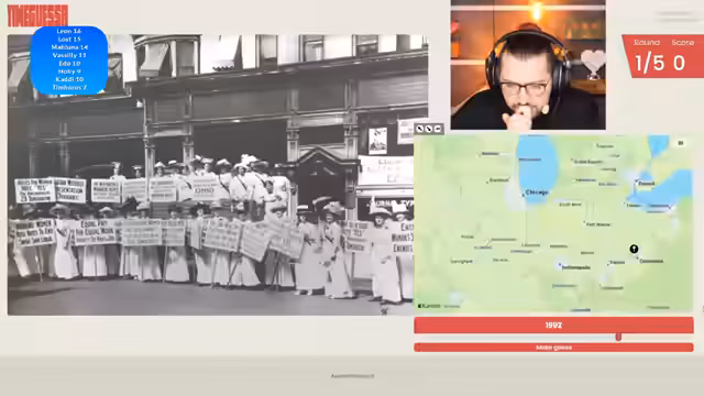 04:18:35Nach dem Start der TimeGaster-Runde werden erste Eindrücke und Schwierigkeiten geteilt. Zunächst wird die geografische Verortung von Ohio und Colorado diskutiert, wobei die Vermutung geäußert wird, dass es sich um amerikanische Orte handelt. Ein Bild mit der Aufschrift "Democracy in Colorado, better conditioned, obtained since women vote" führt zu der Schlussfolgerung, dass es sich um Ohio und Frauenrechte handelt. Die zeitliche Einordnung gestaltet sich schwierig, und es wird spekuliert, dass es sich um die 1970er Jahre handeln könnte. Das nächste Bild zeigt "Islands Company", was zu Ratlosigkeit führt und die Vermutung aufkommen lässt, dass es sich um die Zeit des Zweiten Weltkriegs handeln könnte. Albanien oder ein englischsprachiges Land werden in Betracht gezogen, bevor man sich mangels besserer Ideen für Großbritannien um den Zweiten Weltkrieg herum entscheidet. Die Schwierigkeit, die Zeit anhand von Autos zu bestimmen, wird thematisiert, und es wird festgestellt, dass die Einschätzung zwischen den 1980ern und 1920ern schwankt.
