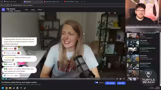 05:26:15Es werden Pläne für zukünftige gemeinsame Projekte mit anderen Streamern geschmiedet, darunter die Idee, das Spiel Paddle Paddle mit Kim zu spielen, wobei jedoch Bedenken hinsichtlich der Auswirkungen auf die Freundschaft geäußert werden. Es wird eine Anekdote über eine frühere Absage eines gemeinsamen Projekts aufgrund von Krankheit erzählt und die daraus resultierende Situation humorvoll dargestellt. Des Weiteren wird ein Armdrücken-Wettbewerb auf der Polaris erwähnt, bei dem auch Jess von Sperling als Favoritin gehandelt wird. Es wird über die Stärke verschiedener Teilnehmerinnen spekuliert und die Möglichkeit eines illegalen Streamer-Armdrückens mit Geldeinsatz auf der Polaris in den Raum gestellt. Die eigenen Fähigkeiten werden aufgrund der kürzlichen Krankheit als geschwächt eingeschätzt. Es wird eine humorvolle Warnung an die Zuschauer ausgesprochen, Rücksicht zu nehmen, da man sich in einem empfindlichen Zustand befinde.