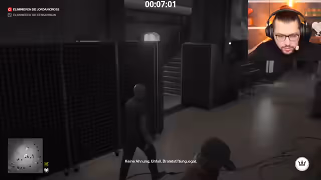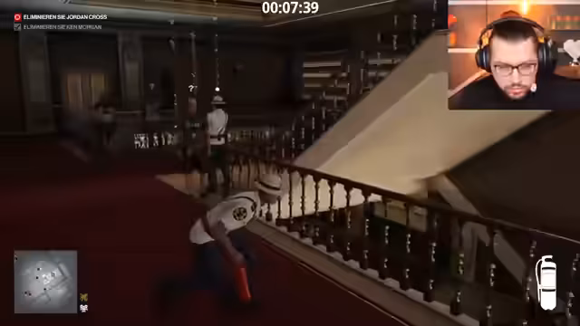 00:37:54Es wird eine Hitman-Mission namens 'Club 27' auf der Schwierigkeitsstufe 'Meister' gestartet, mit dem Ziel, den 'Silent Assassin'-Status zu erreichen. Dies bedeutet, dass nur Unfälle verursacht werden dürfen und keine Schießereien erlaubt sind. Es wird eine Wette mit dem Chat abgeschlossen, ob nach 10 Minuten Missionszeit noch immer doppelt grüne Waffen vorhanden sind. Zunächst wird die Umgebung erkundet, wobei eine Überwachungskamera entdeckt wird, was bedeutet, dass später die Aufnahmen zerstört werden müssen. Es wird überlegt, wie man in die Kaisersuite gelangt, die von privaten Sicherheitsleuten überwacht wird. Eine Idee ist, den Zimmerservice zu rufen und die Person zu überwältigen, jedoch scheitert der erste Versuch. Ein neuer Versuch wird gestartet, wobei die Wette erneut gilt. Es wird eine Notiz des Hotelmanagers gefunden, die besagt, dass ein Kammerjäger engagiert wurde, um eine Holzwurmplage zu bekämpfen, was eine mögliche Verkleidungsmöglichkeit darstellt.