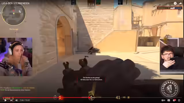 05:39:53Zurück im Studio wird ein gaming-spezifisches Thema aufgenommen: Es wird ein neues 2v2-Counter-Strike-Duell gegen Sonja und Jen für die nächste Woche angekündigt. Direkt im Anschluss startet ein Quiz, bei dem es um Fragen zu Minecraft und allgemeinem Wissen geht. Dabei werden von den Teilnehmern Punkte gesetzt, der Gewinner bekommt ein exklusives, spezielles Bild. Das Quiz endet mit dem Sieg von Jen, was die Teilnehmer dazu bewegt, den Kanal zu abonnieren und zu liken.