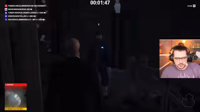 05:20:07Als letzte große Mission des Streams wird ein Auftrag im Modus 'Unbemerkt bleiben' gewählt, der das Schlüsselprinzip darstellt. Der Streamer spawnt mit einem Anzug in einem Bereich, in den er mit diesem nicht darf, was die Mission von Anfang an erschwert. Ohne Waffen und unter Vermeidung von Konfrontationen muss er sich durch die Map schleichen, um das Ziel zu finden und auszuschalten. Nach einem cleveren Manöver und der Nutzung seiner Umgebung gelingt es ihm, die Mission stealthy zu absolvieren und erfolgreich zu extrahieren.