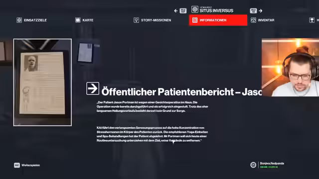 01:32:12Nach erfolgreicher Beendigung der Hitman-Mission erhält der Streamer Bestnoten neue Ausrüstung. Er beginnt die letzte Mission von Hitman 1 in Hokkaido, Japan, mit drei Zielen. Die neue Umgebung ist ein modernes Krankenhaus, das von einer künstlichen Intelligenz gesteuert wird. Der Streamer erkundet die Map und sammelt Informationen über die Ziele, während er versucht, eine Verkleidung zu finden, um unbemerkt in bestimmte Bereiche gelangen zu können.