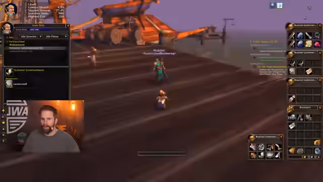 08:00:18Vor dem Eintritt in den Dungeon Deadmines wird über die Loot-Verteilung gesprochen. Ein Schurke mit Level 20 wird als idealer Damage-Dealer identifiziert. Die Gruppe sucht gezielt nach einem Spieler, der Leder-Ausrüstung droppen kann, da der bisherige Tank, Leon, Leder-Tank-Ausrüstung benötigt. Zusätzlich wird die Verkaufsstrategie für Inventarplatz besprochen, um für den bevorstehenden Loot gerüstet zu sein und den Inventarplatz freizuhalten.