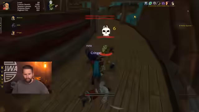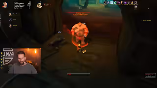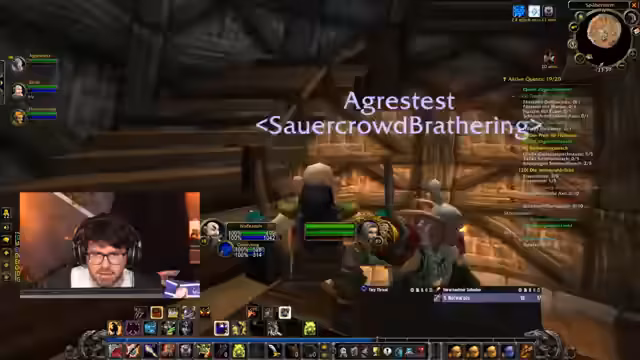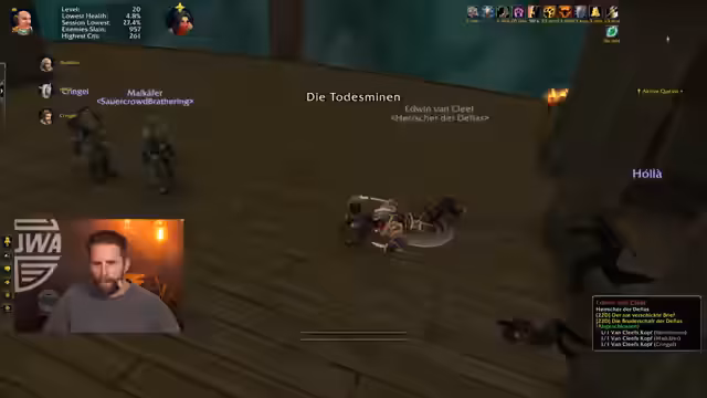 08:15:08Die Gruppe verirrt sich im Dungeon und verfehlt die richtige Route. Nachdem sie den Weg korrigiert hat, wird eine Quest für das "Deadmines"-Gebiet angenommen. Der Streamer bittet einen Spieler, seine Minimap auszuzoomen, um besser navigieren zu können. Es gibt Auseinandersetzungen, da Teammitglieder nicht kommunizieren und fehlerhafte Aktionen wie das Drücken von "Bedarf" bei der Doppelklinge durchführen. Ein Spieler muss sein Haustier neu beschwören, da es die Aggression verloren hat.